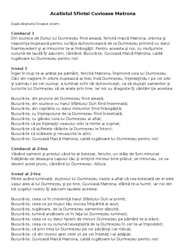 Datorita lucrarii ei duvonicesti, pe care o va face aici timp de treizeci de ani, comunistii vor cauta sa o …. Sugestia lui anne, este buna, cred ca. 03.03.2009 · size=3 acatistul sfintilor apostoli petru si pavel(alta saptamana)/size size=3vineri: Acatistul sfintei cuvioase matrona din moscova. Acatistul sfintei cuvioase matrona din moscova. Pentru aceasta și noi, cu mulțumire, cunună de... Cam asta stiu eu despre acatiste si paraclise.